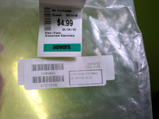 When I was in line, I finally looked at the tag that was on the bag, and noted that it said something about being an Apple SCSI cable. I pannicked for a moment as I wasn't sure if the pinout for the cable would be compatible for what I needed. Unfortunately it was my turn in line, so I just went and paid for it. Here's the bag, with price: