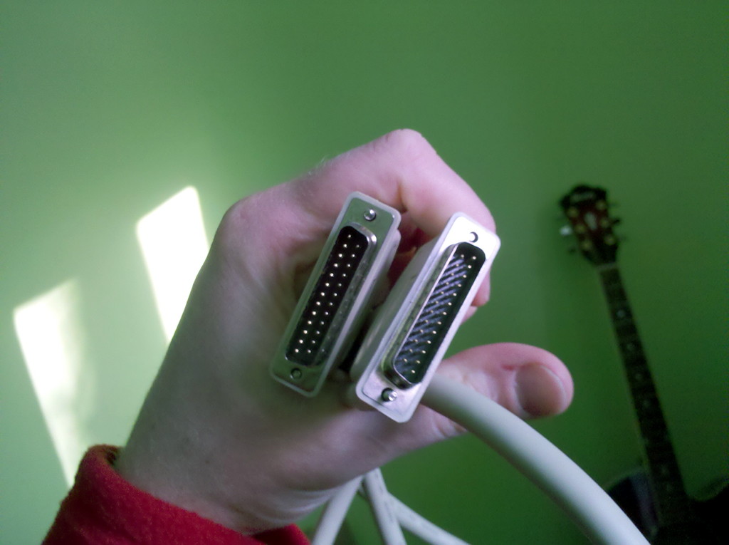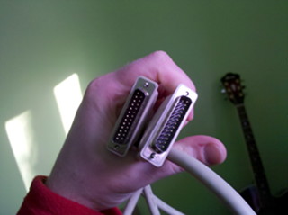 January 12, 2011: UpdateI got my flash cart in the mail the other day. It was then that I realized I didn't have the necessary parallel port transfer cable to copy the roms to it. The part of my brain that deals with cables decided that the printer cables I have were all I needed. I realized in a hurry when I had the part in my hands that it was no centronics connector on the board. What I needed was a cable with DB-25 male connectors on each end. As I didn't want to wait another few days for a cable to come in the mail, I decided to check out a couple of thrift stores that I knew had bins of cables. Luckily, the first store I checked had exactly what I needed: