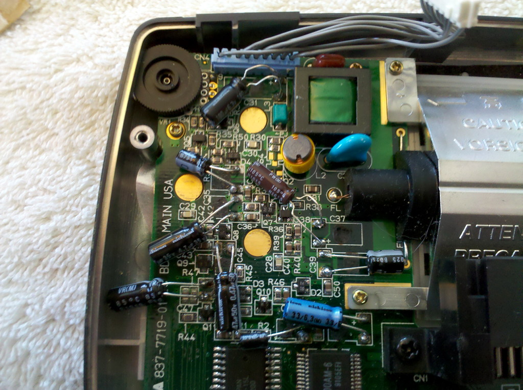 January 21, 2011: Solder of FortuneIt was -24F(-31C) here this morning. I was more than pleased by the fact that my classes for today were cancelled earlier in the week. I'm not sure my car would have started, anyway. Plus I finally found some time again for working on my RC projects. I jumped right in this morning on soldering again. I did 2 more practice joints, then took the plunge. Here's video one: Got the 2 sound caps replaced. I have a high pitched whistle when the volume is way up on the speaker. You can kind of always hear it in the headphones, but its volume changes with the rest of the volume. That went well enough so I proceeded with the video caps. My method was to use the pliers to break the glue bond to the board, then use my fingers to wiggle the cap back and forth till the wires broke. Then I'd take the pliers again and bend the remaning cap wire till it broke off the old solder joints. I'd re-tin the pads and the cap legs, and put em together. Video two: I could've stopped there but It was going well and I had the other caps. The pads were nice and clean on these so they went really quickly. Video three: Some pics of the final product: