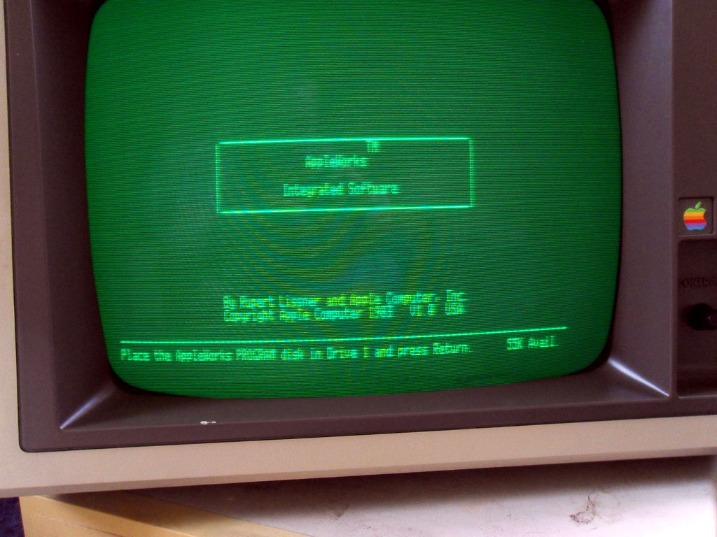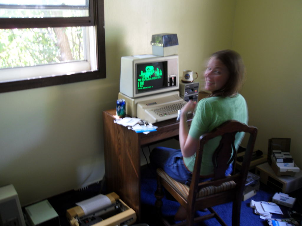So, I put this together via a small BASIC program: Secondarily, I am convinced that this is not the solution to my document recovery plan. It would take a significant amount of time to print off each document, let alone the amount of paper. And, I don't know if I can even find another print ribbon for this thing if I use this one up. I'm really leaning towards the plan I mentioned earlier. Anyone have a suggestion for a cheapish soldering iron for a noob? 2:07 PM 7/13/2010 -- ADVENTURES IN RETROCHALLENGEI didn't get anything done with the Apples over the weekend. I was out of town for a funeral Friday through Sunday, and my wife kept me busy with tasks around the house yesterday. However, one small victory from Friday afternoon: I got the wife (happily) playing Oregon Trail! The downside of course was that she didn't want to stop, but I feel it adds some level of legitimacy to my endeavors. Sorry about the blur. Anyway, today I managed to get the IIplus cleaned up sparkly clean. I had done the monitor last week, though there's something up with the anti-glare covering on the monitor. Seems like it got moisture behind it (perhaps?) and then mold or just water stains, I can't tell. Anyway, the bottom half gets a bit blurry, not that you can tell: Unfortunately both of its floppy drives were DOA, but obviously it could boot from the known good one from IIe#2. They both respond to the boot but never do any accessing. I'll have to get in there with some cotton swabs and isopropyl alcohol to see if I can get them to do anything. Apart from that, I'm still transferring disks. The audio connection is pretty finnicky. Sometimes I can do three or four disks in a row with no problems, other times I can do one and the next hangs at block 002, 003 or 004. I feel like I have the audio levels set exactly where they should be. I think it's the jacks on the apple that are a bit dirty or noisy. Seems like if I pull the line connector out and put it back in again, it usually fixes it. I've had no luck on finding an emulator to assist me in printing. However, I may try to do this. Essentially I would build a little converter to connect the parallel port output of the Apple to the parallel port input of a PC. I'm not positive about how the software he has is set up, but what I would optimally do is print from the Apple's word processor, and it would capture it as a text document on my PC. Some roadblocks: