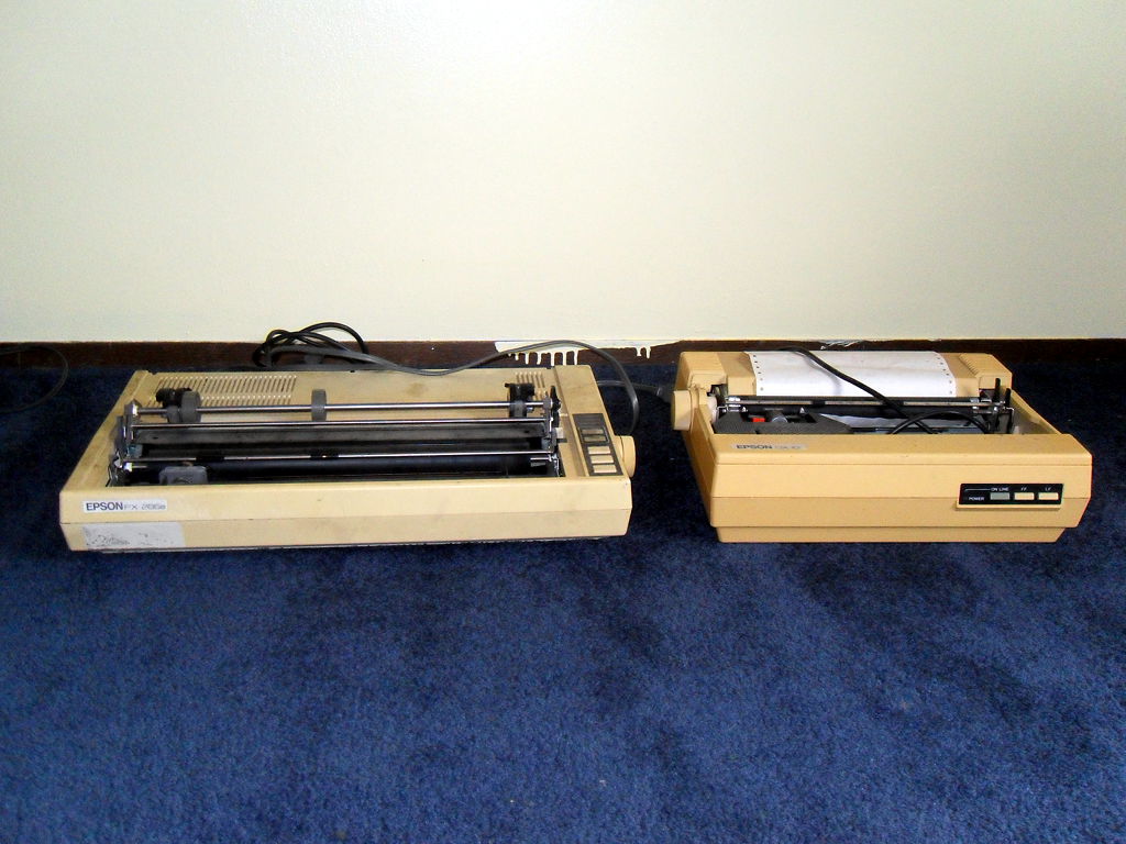 Each have monitors and a pair of 5.25" floppy drives. All are quite yellowed and in states of extreme dinginess. I opened all the drives and found that the IIe's still had floppies in them. We have non-official copies of Wordstar, Apple Works, and a disk labeled "Rescue Raiders" on the A side, and "Sub Commander, Star Trek, O'Rilleys Mine" on the B. One thing that I can already see that I will benefit from in this challenge will be getting a better working knowledge of the actual hardware involved. These machines are leftovers from my dad's heyday as a computer hobbyist. The limits to my involvement were playing games and dabbling in programming. I have no idea what these things have for cards in them. One thing's for sure...I'm going to find out. The printers are: