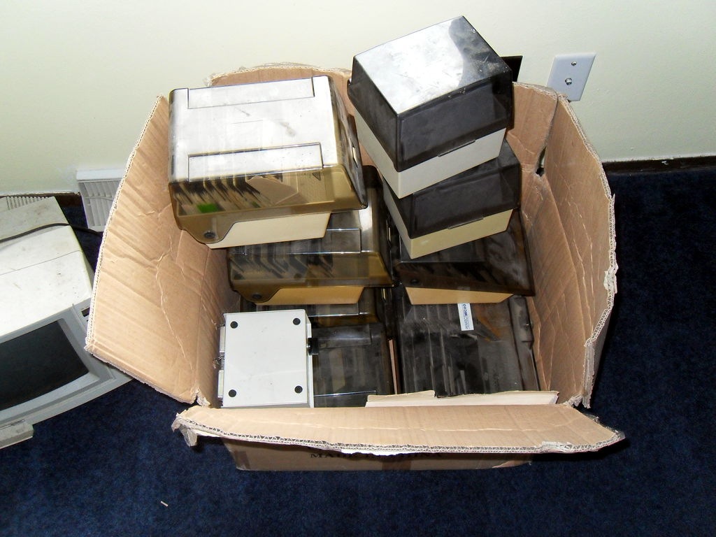 I know nothing about these two, although if I remember correctly, one sounds like a typewriter when it prints. The other one makes noises like a wood planer or something. I wonder if I can still find the special paper for these things. Finally we have a Corvus...uh...actually I don't know what model it is, it doesn't say. I believe it is a 10MB unit though: I also have a huge box of disks: Almost all of them are bootlegs. I had no idea it was so sketchy when I was a kid, but my dad had a "source" that copied and sold programs. I'm sure they were all cheap, but not exactly the right way to go about it. Next up, cleaning. 11:11 AM 7/4/2010 -- HURRY UP AND WAIT!So far my Retro Challenge is off to a non-start. My wife and I closed on a house on June 30th, so I have been busy the last few days moving furnature and unpacking. I plan on bringing the Apple II's home today, so likely tonight I will be able to begin my adventure. However, in traditional fashion, the man to flip the switch on my internet won't be out until the 7th of July, so until then I will not be able to update my blog. I saw the machines in storage yesterday. I think there were two IIe's and a II+. There were 2 monitors and two printers, plus the Corvus hard drive thing that I'd like to get working as well. I also remembered the other day a little hack of a program I had done when I was in High School. If I can find the disk I had it saved on I'll maybe do a video of that, too. Also, I got busted during the move. I had some of my computers stacked up in the hallway, and she said, "Wow, now I can see how many computers we have. That's like five more than normal people!" What she didn't know is that I had already moved at least 5 others to storage already :) Anyhoo, I'm looking forward to getting this off the ground. I'll keep documenting my progress and put it all up on Wednesday. Cheers! |